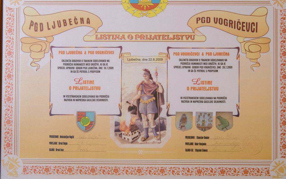 Po več letih prijateljevanja z društvi Sladka Gora, Cezanjevci, Vogričevci in Branoslavci je bila 22. 8. 2009 podpisana listina prijateljstva.
